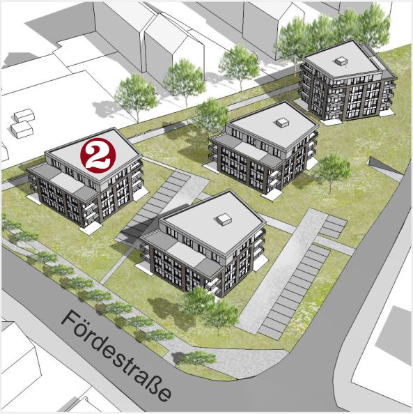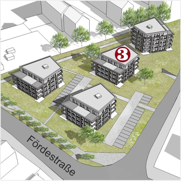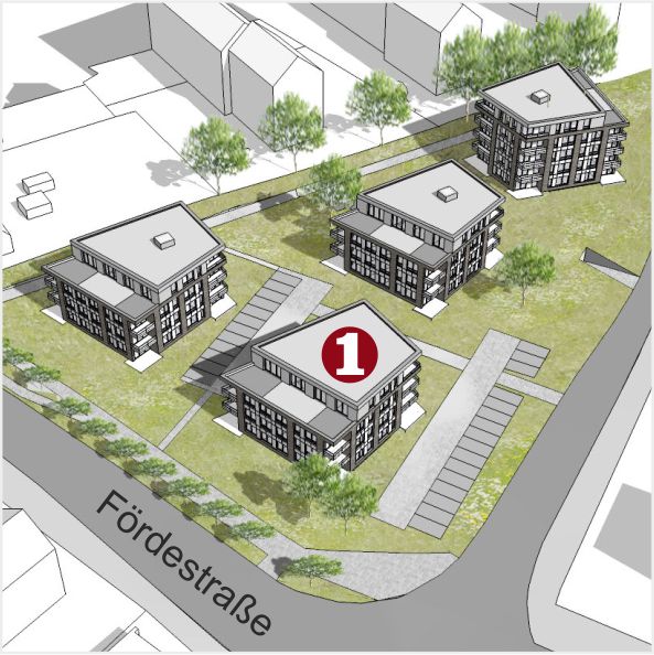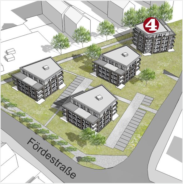 Insgesamt sind vier Stadthäuser mit 68 attraktiven Mietwohnungen entstanden – von 40 m² bis 120 m², von Erdgeschoss mit Terrasse bis Penthouse mit Fußbodenheizung und Weitblick von der Dachterrasse, teilweise sogar mit Wasserblick über die Marineschule.